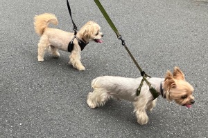 わんこのお散歩はママが買い物をした荷物の整理をしている間にヨーキー弟とパパが先に行き、その後に兄がママパパと一緒に行きました。