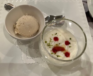 デザートが玄米アイスと酒粕入りリオレ。普通はお米に牛乳と砂糖を入れて煮込むのですが、それに酒粕が入っているようです。結構お腹がいっぱいになりました。